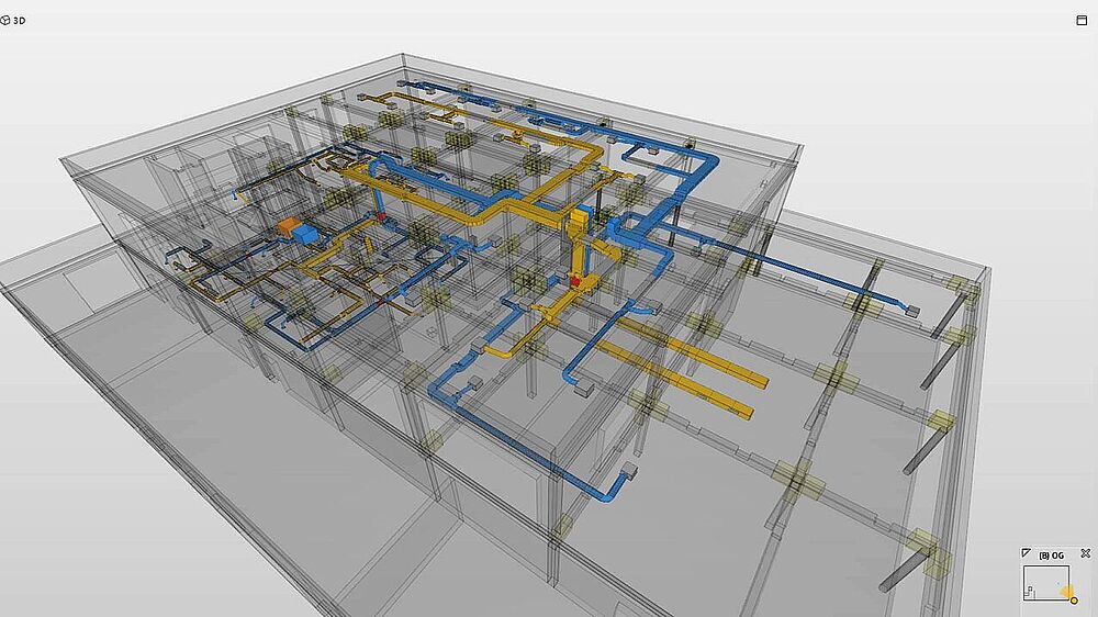 For a new multipurpose building for the building services wholesaler Gottschall + Sohn in Grevenbroich, the planning office baues + partner from Korschenbroich was responsible for the architectural and structural design, as well as the thermal insulation, soundproofing, and fire protection. It was a perfect opportunity to fully test the BIM methodology. The new build expands the company’s existing headquarters and includes, alongside a large sanitary showroom, various training and seminar rooms, a cafeteria and kitchen, and a single-stream daycare center operated by the city of Grevenbroich. Structurally, the building is a two-story reinforced concrete frame construction with a load-bearing reinforced concrete floor slab. Reinforced concrete shear walls extending across both floors provide structural stability. Depending on acoustic and fire protection requirements, the different usage areas are separated by masonry walls.
