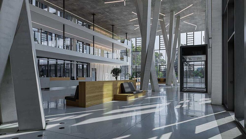 Heidelberg Materials – formerly HeidelbergCement – is one of the largest building materials manufacturers in the world. The new corporate headquarters in Heidelberg, completed in 2020, not only brought together the various departments that had previously been spread across the city. The company also created a vast showroom that showcases the wide range of its products – simply by the building being made of them. The complex consists of three cube-shaped volumes, each five to seven stories high above ground, which interlock and align along a central connecting axis. In total, around 52,000 square meters of gross floor area are available to the approximately 1,000 employees. In addition to modern office spaces, spacious communal areas, a cafeteria, and conference rooms, the ensemble – which is certified DGNB Platinum – also includes generously landscaped outdoor areas.