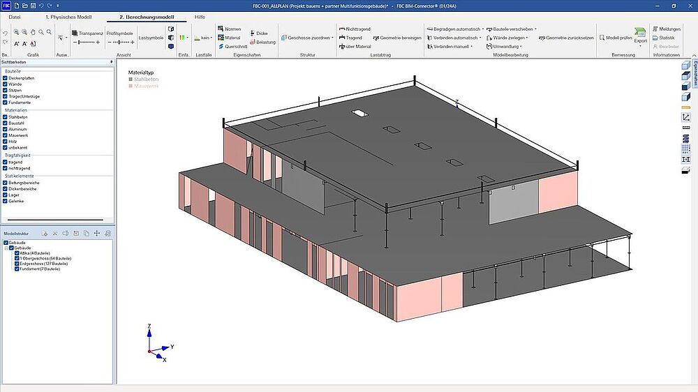 To that end, the discipline model was exported via IFC interface to FRILO’s BIM-Connector®. Because materials and component classifications had already been accurately assigned in ALLPLAN, the physical model could be reduced to a calculation model at the push of a button.