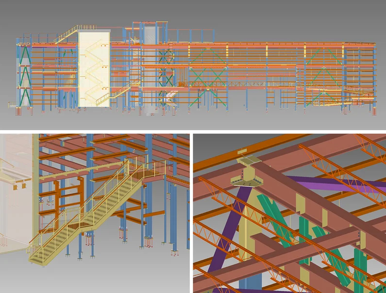 Detailing was closely coordinated with the client's detailers, pre-engineered structures, and contractor-installed anchors. SDS2 handrail members were used in mass quantity, as well as multiple stairs, ladders, and elevator towers. The project's engineer helped fabrication and minimized Universal's connection design work by providing many SDS/2-friendly connections. Because of SDS2 improvements, Universal was able to make on-the-fly changes to the model, allowing minimal work to be done on the 2D details.