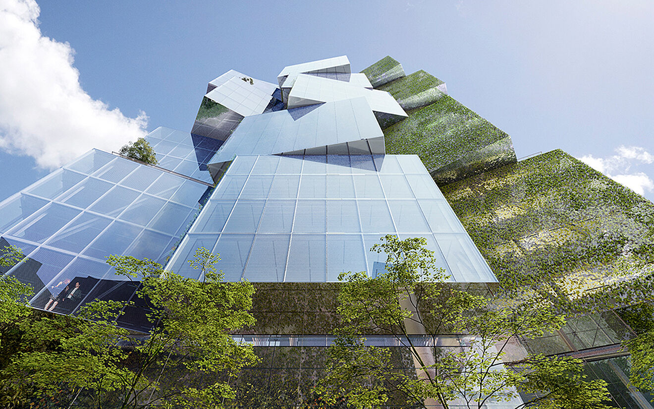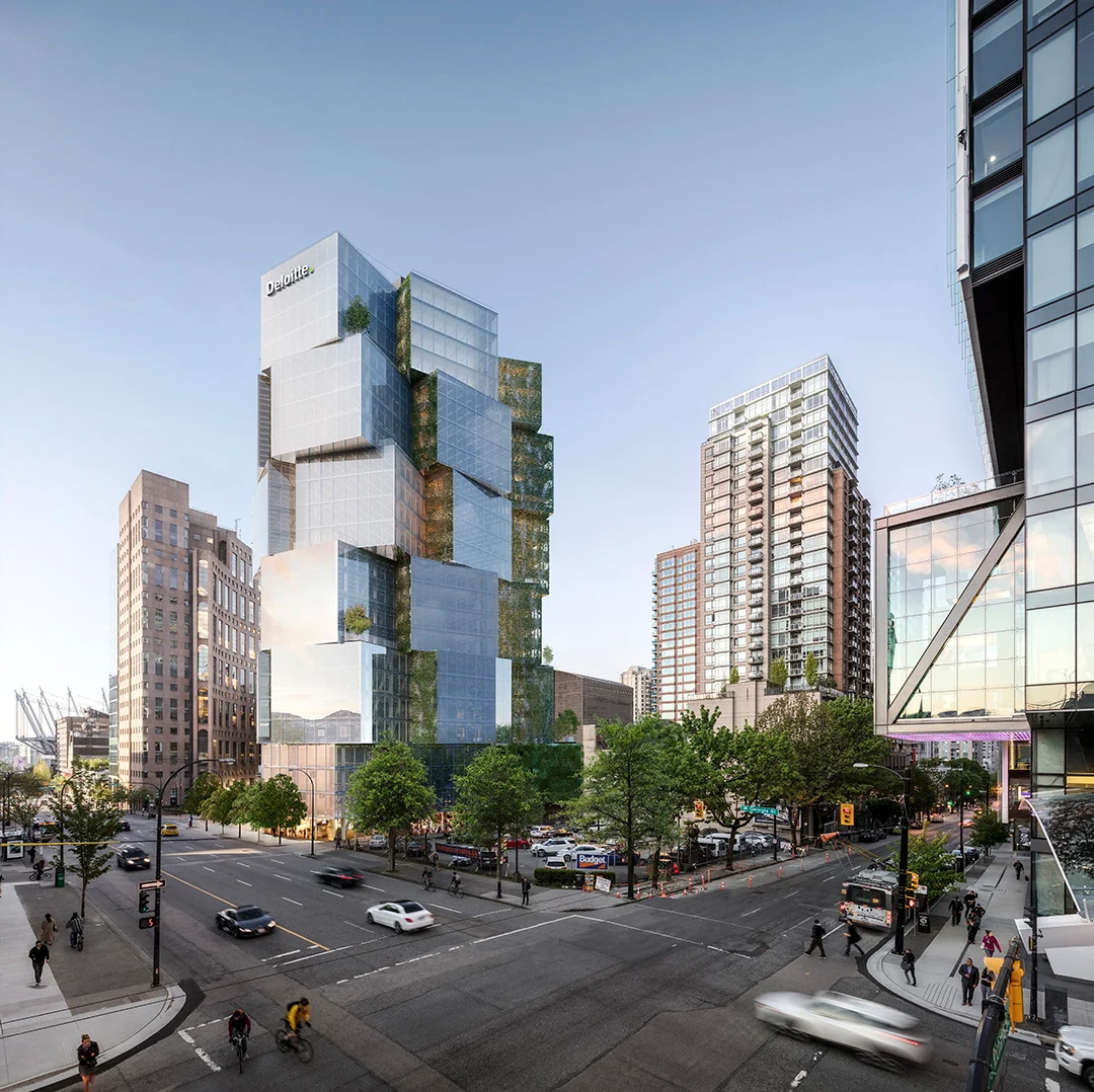 The office building, developed by Westbank and Allied and soon to become Deloitte’s new Vancouver headquarters, is comprised of four-story cubes stacked at various angles around a concrete core. The glass façade and glass floors, accented by vertical green spaces, will offer sweeping views of Vancouver’s fast growing downtown central business district.