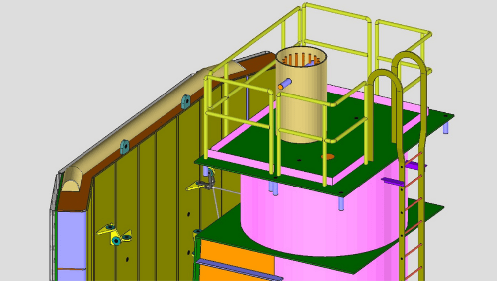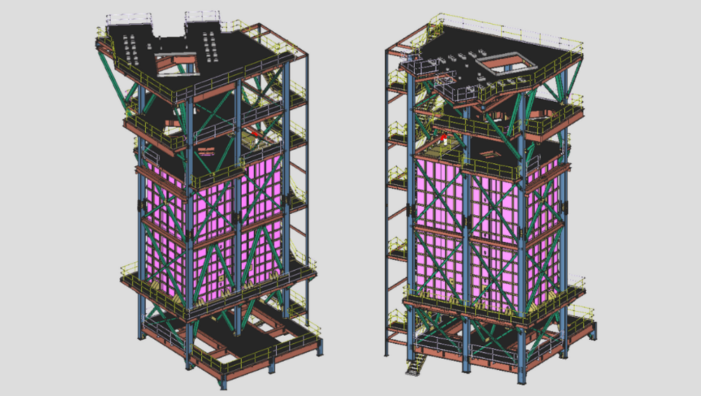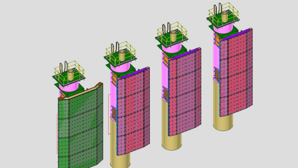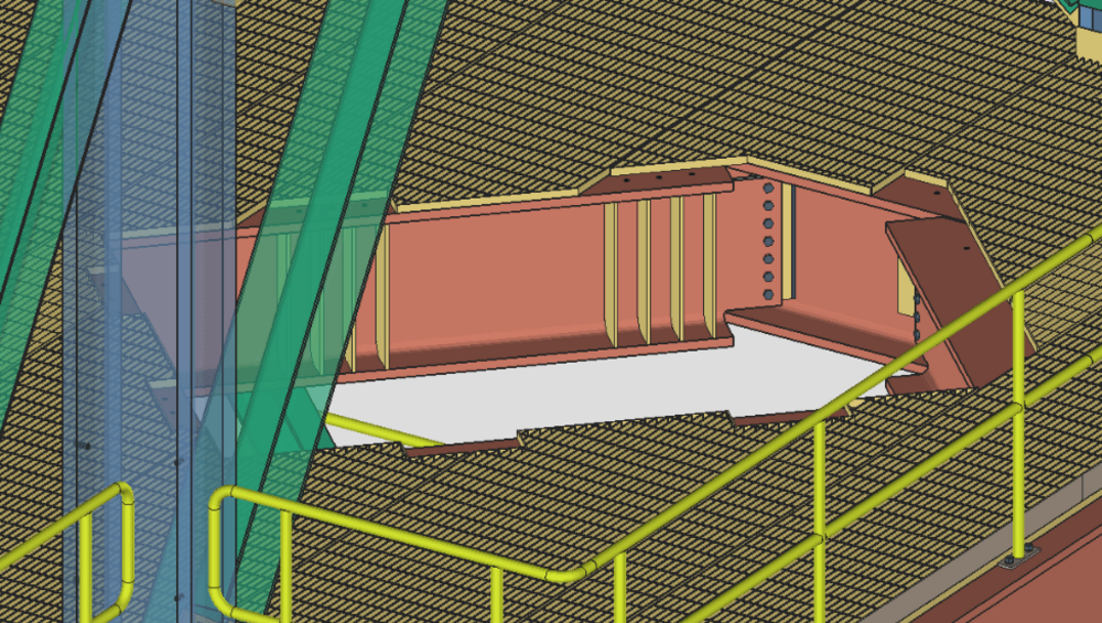 This marine structure, utilized in dock operations, consists of modular ‘fenders’ that absorb impact energy, highlighting SDS2's modeling versatility. The project involved intricate plate assemblies with unique features like ‘weep holes’ to facilitate pressure testing, curved fender profiles, an underwater ladder designed to eliminate welding and touch-up coatings and minimize long-term maintenance, and connections with uplift chains that needed to withstand dynamic underwater forces and vibrations. Given the marine environment, ensuring adequate corrosion protection was crucial, and applying coatings, surface preparations, and other protective measures added complexity to the detailing. As the project progressed, SDS2's iterative design features allowed the detailers to explore design alternatives and assess their impact efficiently. This capability was particularly valuable when evaluating various ladder attachment methods, aiding in decision-making, and optimizing the connection's design.
