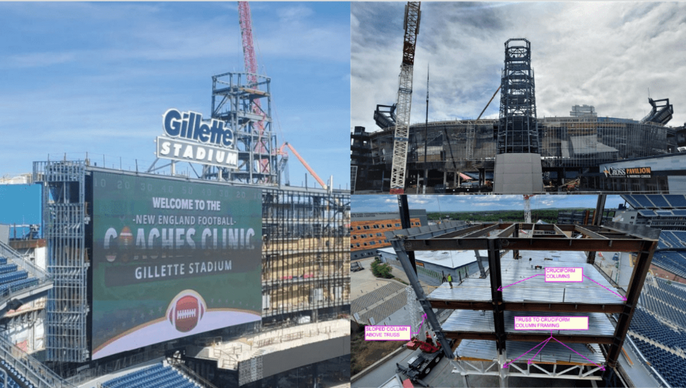 Gillette Stadium is the iconic home of the New England Patriots football team. A major renovation of the north end zone featured an enhanced 218-foot lighthouse, a 22,000-square-foot high-def video board, and additional amenities. The project came in at 3,000 tons, and structural challenges were numerous with multiple types of truss framing connections at cruciform columns, heavy connections at vertical and horizontal brace locations, and coordination of precast elements on sloped beams and columns.