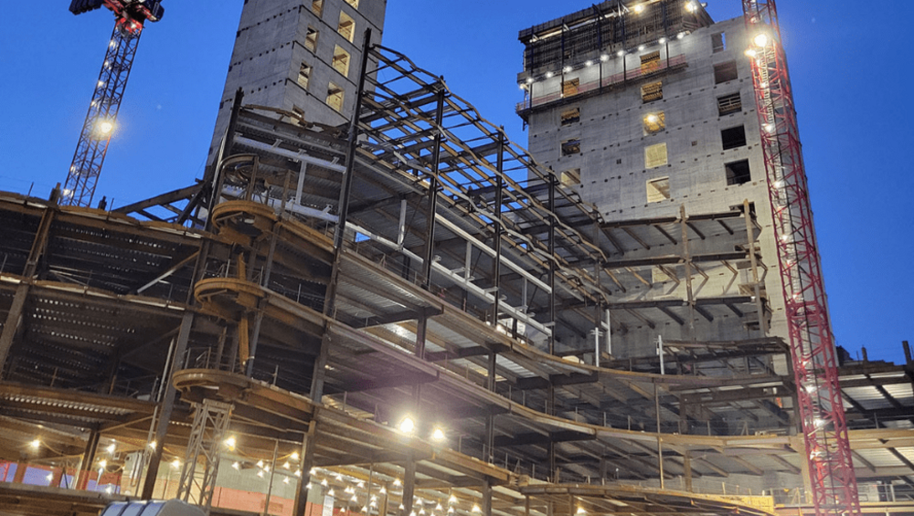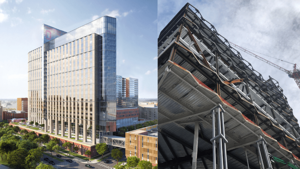 This 1.9 million-square-foot inpatient hospital is the largest single facilities project ever undertaken at the Ohio State University. It required approximately 10,000 tons of steel and featured a variety of challenging features, including cupola framing, kink columns, scroll cantilever with a cambered tip, lantern steel at the roof and a lantern structure throughout the building, a sawtooth structure at the perimeter of all floors, curtain wall connection supports, cambered trusses, celio framing, and a bridge connecting new and existing structures. Most of the connections were developed from SDS2, though some around irregular framing features required extensive coordination with the customer.