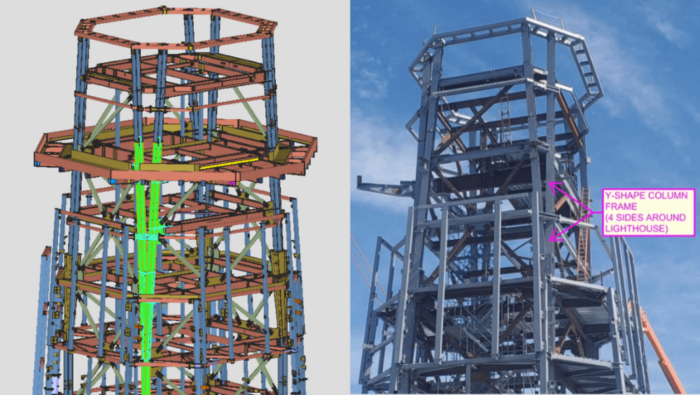 The lighthouse feature was constructed in segments, each detailed as shop-assembled frames, with Y-shaped and tapered columns. Because a significant portion of the structure is visible to the public, special attention was given to ensuring correct bolt orientations in both erection and shop drawings, as well as to the faying surface directions for SC bolt conditions.