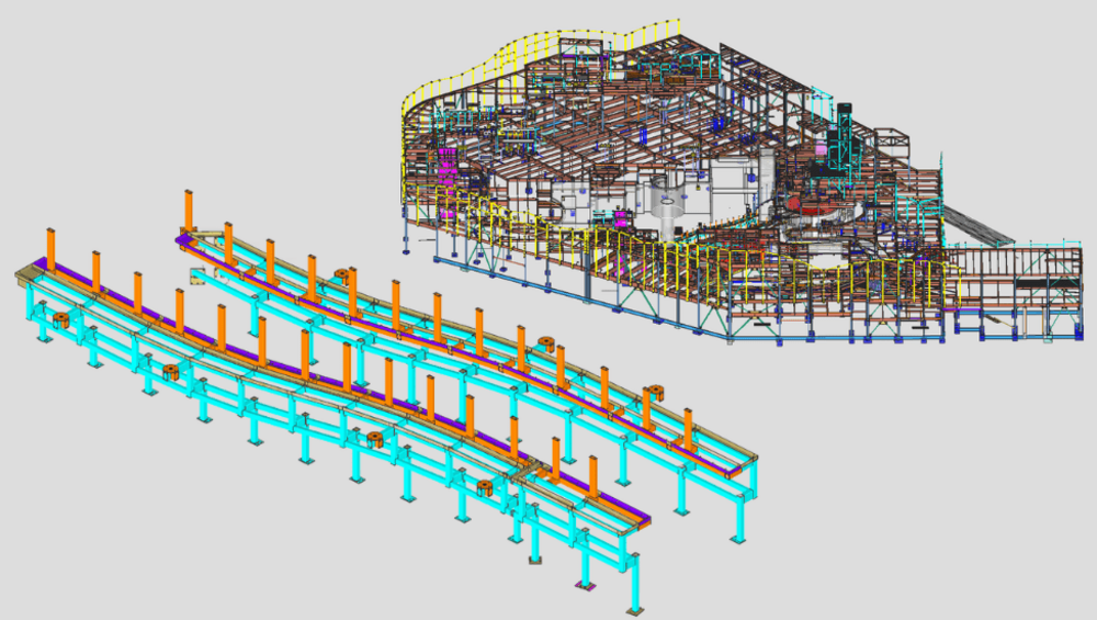 This mine expansion involved the construction of a 330-ton chute support framing system. This system included robust connections and multiple chutes to facilitate efficient operations. Notably, the cantilevered section of the framework was skillfully designed to create a visually appealing walkway encircling the surge bin. This was achieved through the strategic placement of skewed supports, enhancing both functionality and aesthetics. SDS2 automated a significant portion of the shear connections, expediting the design process. Additional SDS2 tools for plate work, stair and handrail items, and reference drawings were also implemented to deliver this functional and visually appealing industrial structure efficiently and accurately.