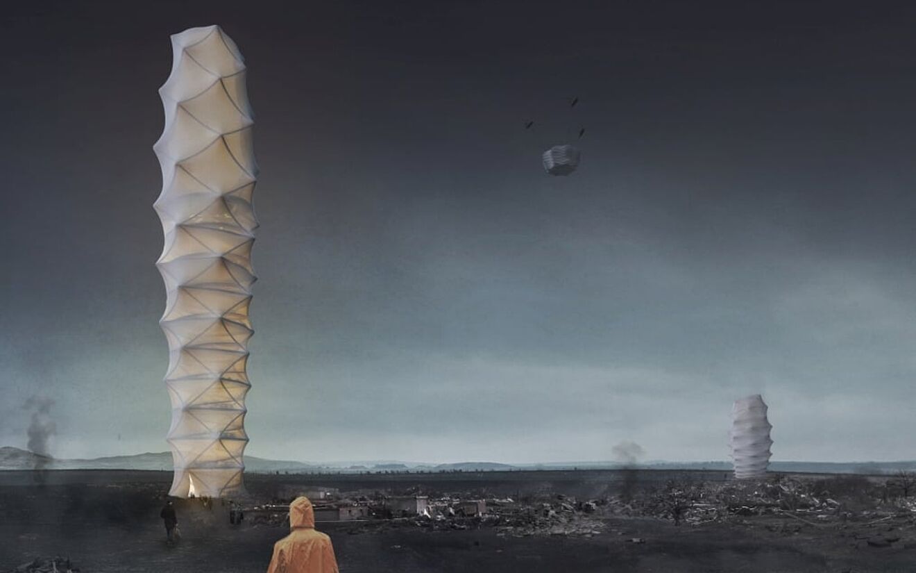 Einer Statistik der Thomson Reuters Foundation zufolge verlieren jährlich 14 Millionen Menschen ihr Zuhause durch Naturkatastrophen. Bei steigender Weltbevölkerung und gleichzeitigem Klimawandel wird diese Zahl vermutlich noch steigen. Die polnischen Architekturstudenten Damian Granosik, Jakub Kulisa und Piotr Pańczyk nahmen sich in ihrem Entwurf Skyshelter.zip dieses Problems an und kreierten eine temporäre Notfallunterkunft der besondere Art. Eine Art Pop-up-Zelt im Hochhausformat soll möglichst vielen Notleidenden möglichst schnell ein Dach über dem Kopf und Raum für medizinische Versorgung bieten.