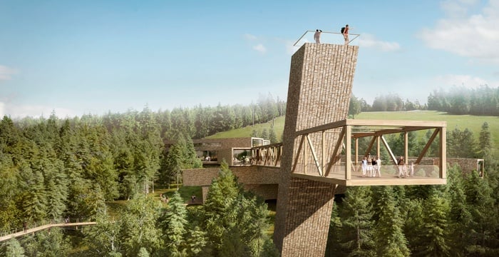 Im Wettbewerb durchgesetzt haben sich Sturm + Wartzeck Architekten aus dem hessischen Dipperz im Team mit schlaich bergermann partner Ingenieure. Ihr Entwurf ist eine spektakuläre Interpretation des vorgegebenen Themas Holz und Wald: Die architektonische Struktur des neuen Besucherzentrums erinnert an übereinanderliegende, mächtige Baumstämme. Seine Attraktion wird ein „Skywalk“ sein – ein offener Steg mit Aussichtsplattform in 35 Metern Höheüber den Baumwipfeln. Gebaut wird dabei mit Materialien aus heimischen Hölzern.